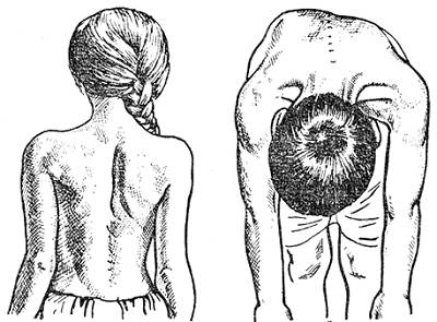 - Выраженная деформация позвоночного столба с появлением видимого горба и углом искривления более 40°. Больной не может даже с усилиями выпрямить позвоночник. Сильная деформация грудной клетки и таза.