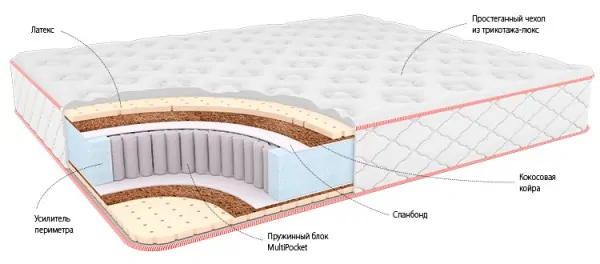 Самые жесткие модели в качестве наполнителя могут содержать т. н. «койру» – натуральное волокно кокоса с пропиткой из латекса. Дополнительное преимущество данного состава заключается в том, что он очень хорошо вентилируется, обеспечивая дополнительный комфорт владельцу.