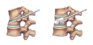 Используется игла со скошенным концом. Благодаря этому у врача есть возможность управлять распределением цемента в пределах тела позвонка. Чтобы запломбировать тело позвонка, достаточно 4-6 см (куб.) цемента.