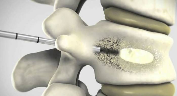 - Суть процедуры в том, чтобы ввести в позвоночное тело цемент, минимально повредив кожу и ткани. Для этого через кожу вводится металлическая игла.