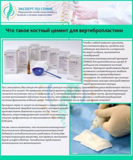 Во время операции в тело поврежденного позвонка вводится металлическая игла. Через нее под флюороскопическим контролем врач вводит специальную смесь. В ее состав входят следующие компоненты:
