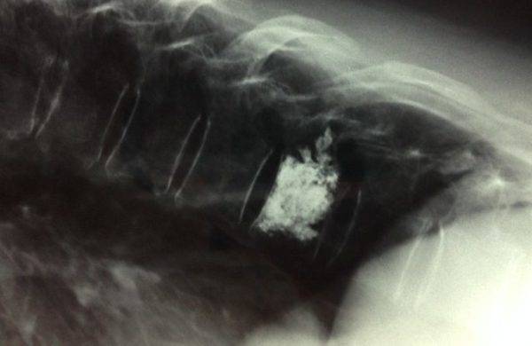 Вытекание полиметилметакрилата в область позвоночного столба. На поврежденных позвонках могут быть многочисленные трещины, через которые вещество изливается в позвоночный столб