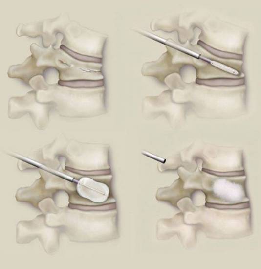 | Этап 2: операционный процесс | В ходе операции, в области локализации повреждения осуществляется прокол, через который вводится специальная металлическая трубка. В трубку пропускается игла, при помощи которой берется проба костной ткани. Изучив костный образец, лечащий врач вводит в поврежденную область специальный баллончик, наполненный контрастирующим веществом. Оно необходимо для того, чтобы обеспечить возможность слежения за ходом операции при помощи специальных приборов. Также, контрастирующая жидкость формирует мышечный каркас, позволяющий правильно заполнить полости медицинским цементом. Цемент вводится в поврежденный участок после изъятия контрастирующего вещества и извлечения баллончика. Застывает медицинский цемент быстро, в течение 6-10 минут |